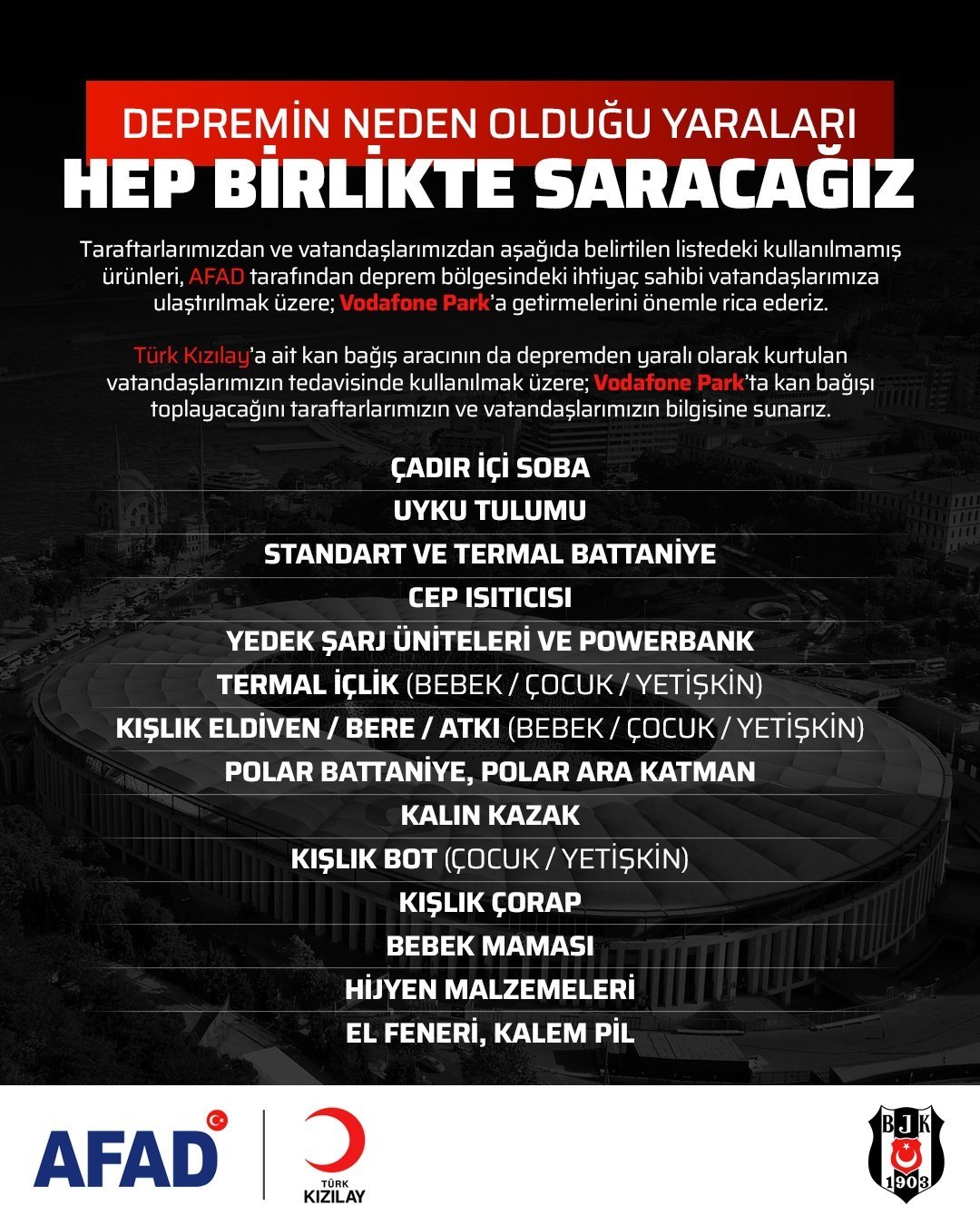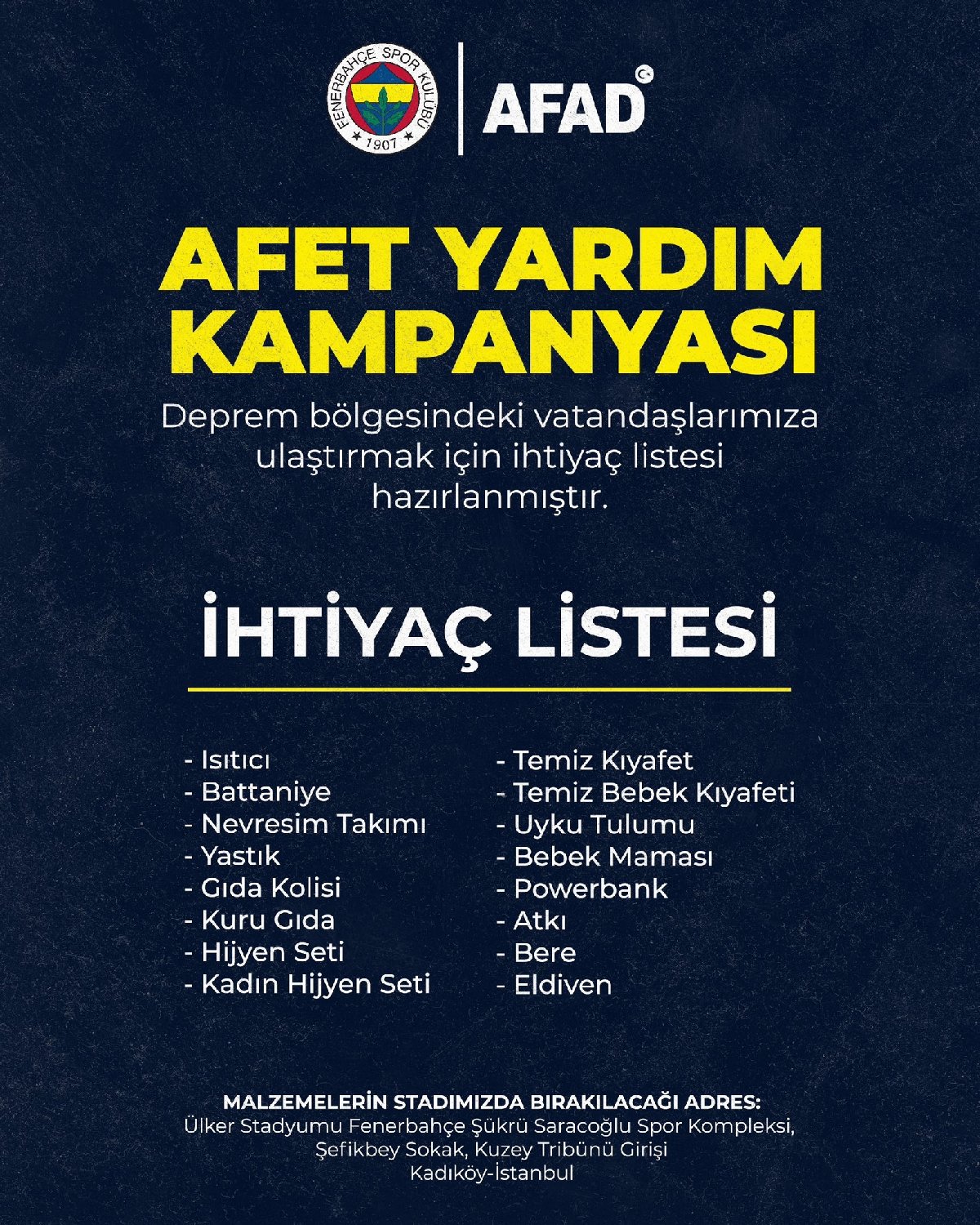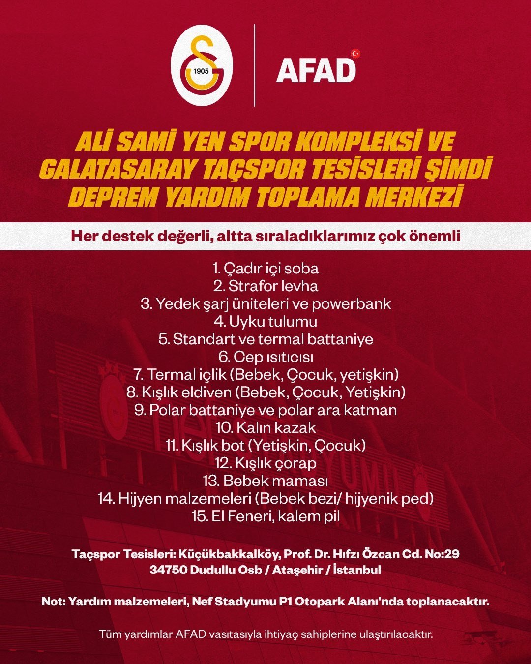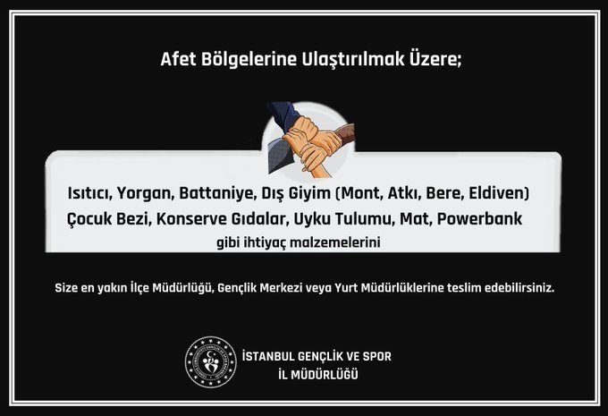 İstanbul Gençlik ve Spor İl Müdürlüğü tarafından yapılan duyurulara göre afet bölgelerine ulaştırılmak üzere ihtiyaç listesi yayımlandı.