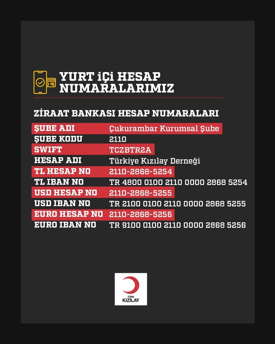 Kızılay deprem bölgelerine maddi destek vermek isteyenler için hesap numaralarını paylaştı.