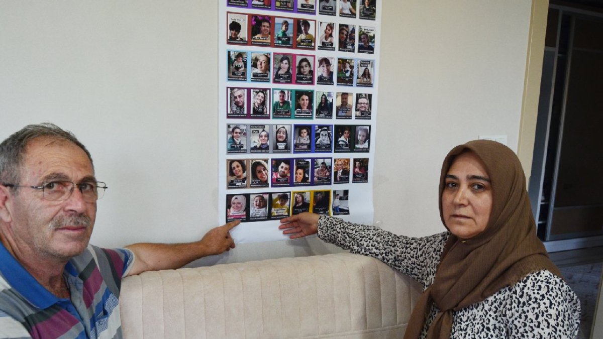 Kızları ve torunlarının bulunmasını isteyen çiftin evinin duvarında rezidansta halen ulaşılamayan kişilerin fotoğraflarının bulunduğu afiş yer alıyor.