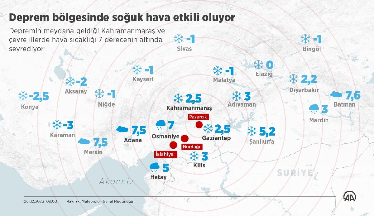 ADIYAMAN: Adıyaman'da hava bugün karla karışık yağmurlu, sıcaklıklar en düşük 1, en yüksek 4 derece, salı karla karışık yağmurlu, en düşük sıcaklık 1, en yüksek sıcaklık 3 derece, çarşamba çok bulutlu, en düşük sıcaklık sıfırın altında 2, en yüksek sıcaklık 2 derece, perşembe ve cuma parçalı bulutlu, en düşük sıcaklık sıfırın altında 3, en yüksek sıcaklık 4 derece olarak öngörülüyor.