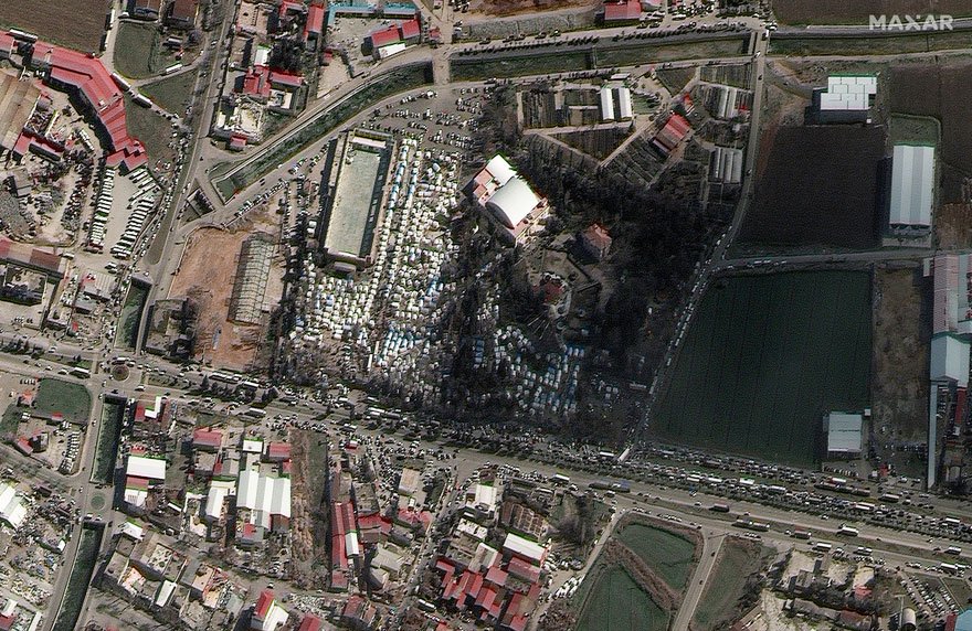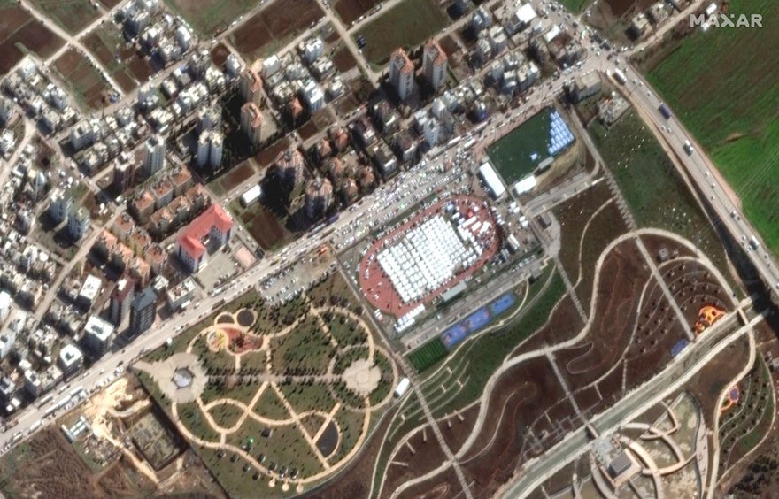 Antakya'nın bazı bölgelerinde çadırlar kurulduğu görülüyor.Osmaniye, Adıyaman, Kahramanmaraş, Gaziantep ve Hatay illerinde çekilen uydu görüntülerinde birçok binanın yıkıldığı görülürken, bazı bölgelerde yıkılan bina sayısının ayakta kalan binalardan çok olduğu gözler önüne seriliyor.