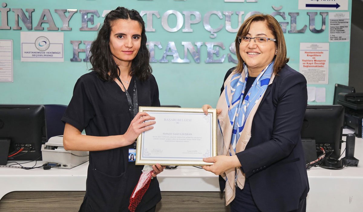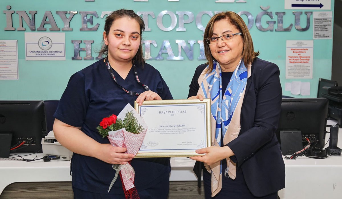Her ikisi de bekar olmalarına karşın birer anne şefkatiyle kuvözdeki bebekleri koruma adına kendi canlarını ortaya koyan Gazel Çalışkan ve Devlet Nizam’ın görev yaptığı İnayet Topçuoğlu Hastanesi’ni 14 Mart Tıp Bayramı nedeniyle ziyaret eden Gaziantep Büyükşehir Belediye Başkanı Fatma Şahin, Gazel ve Devlet hemşirenin yanı sıra, deprem sırasındaki fedakar davranışları nedeniyle çocuk servisi hemşiresi Şeyma Alakuş’a teşekkür belgesi ve çiçek verdi.