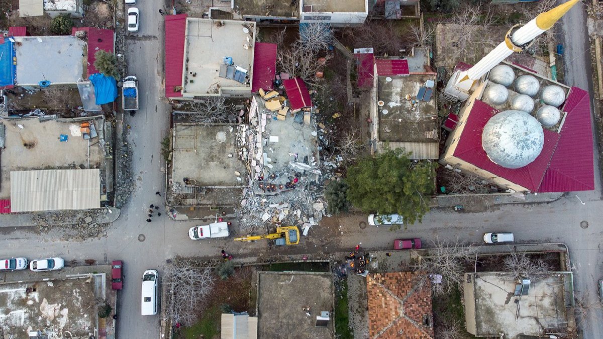 Kahramanmaraş'ın Pazarcık ilçesinde dün saat 04.17'de 7,7; Elbistan ilçesinde saat 13.24'te 7,6 büyüklüğünde deprem oldu. İlk depremin merkez üssü Pazarcık'tan saatler sonra ilk görüntüler geldi. AA drone ile ilçeyi havadan görüntüledi.