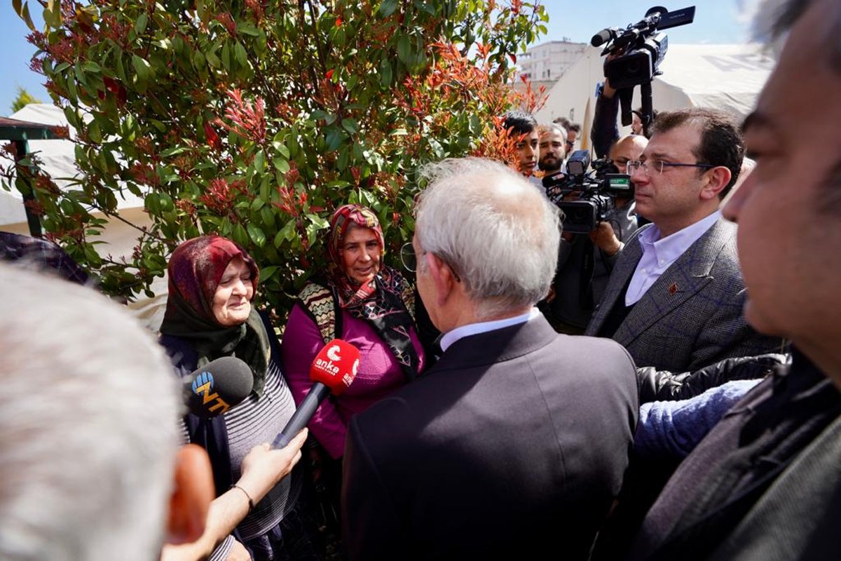 Şahinbey’den Nurdağı’na geçen Kılıçdaroğlu, Nurdağı Eski İslahiye Yolu 1C Çadır Alanı’nda, “Millet Buluşması” toplantısını gerçekleştirdi. Canlı yayınla kamuoyuna seslenen Kılıçdaroğlu ardından İmamoğlu ve beraberlerindeki heyet ile yakındaki çadır alanını ziyaret etti. Vatandaşlara baş sağlığı dileyip, geçmiş olsun dileklerini ileten Kılıçdaroğlu ve İmamoğlu, depremzede yurttaşlardan gelen sorunları dinledi.