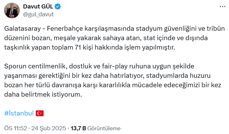 Derbide oyunun kısa süre durmasına neden olan meşale ve bazı taşkınlıklar dışında büyük bir olay olmazken İstanbul Valisi Davut Gül, sosyal medya hesabından açıklama yaptı.