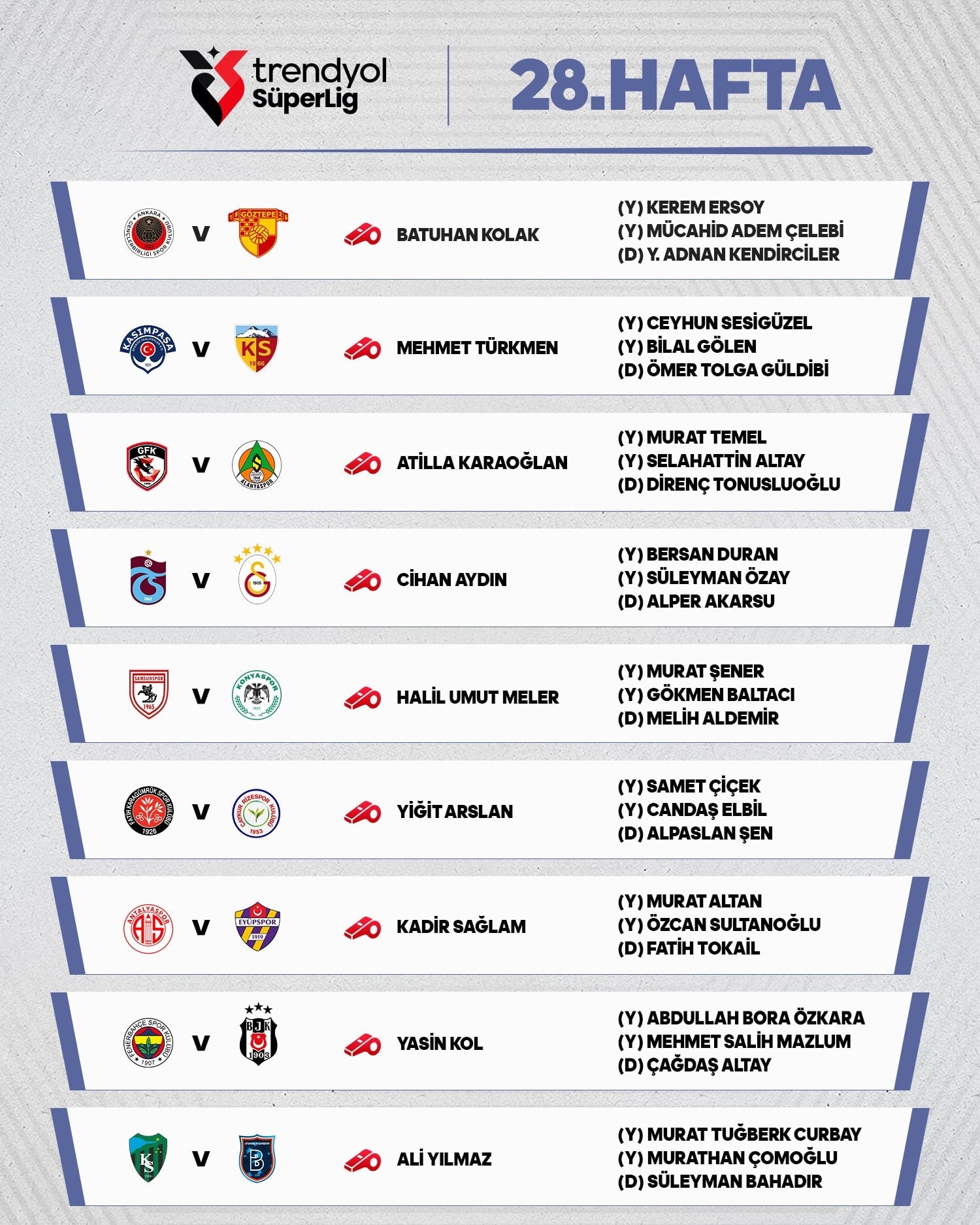 Trendyol Süper Lig'in 28. haftasında oynanacak derbilerin hakemleri belli oldu.