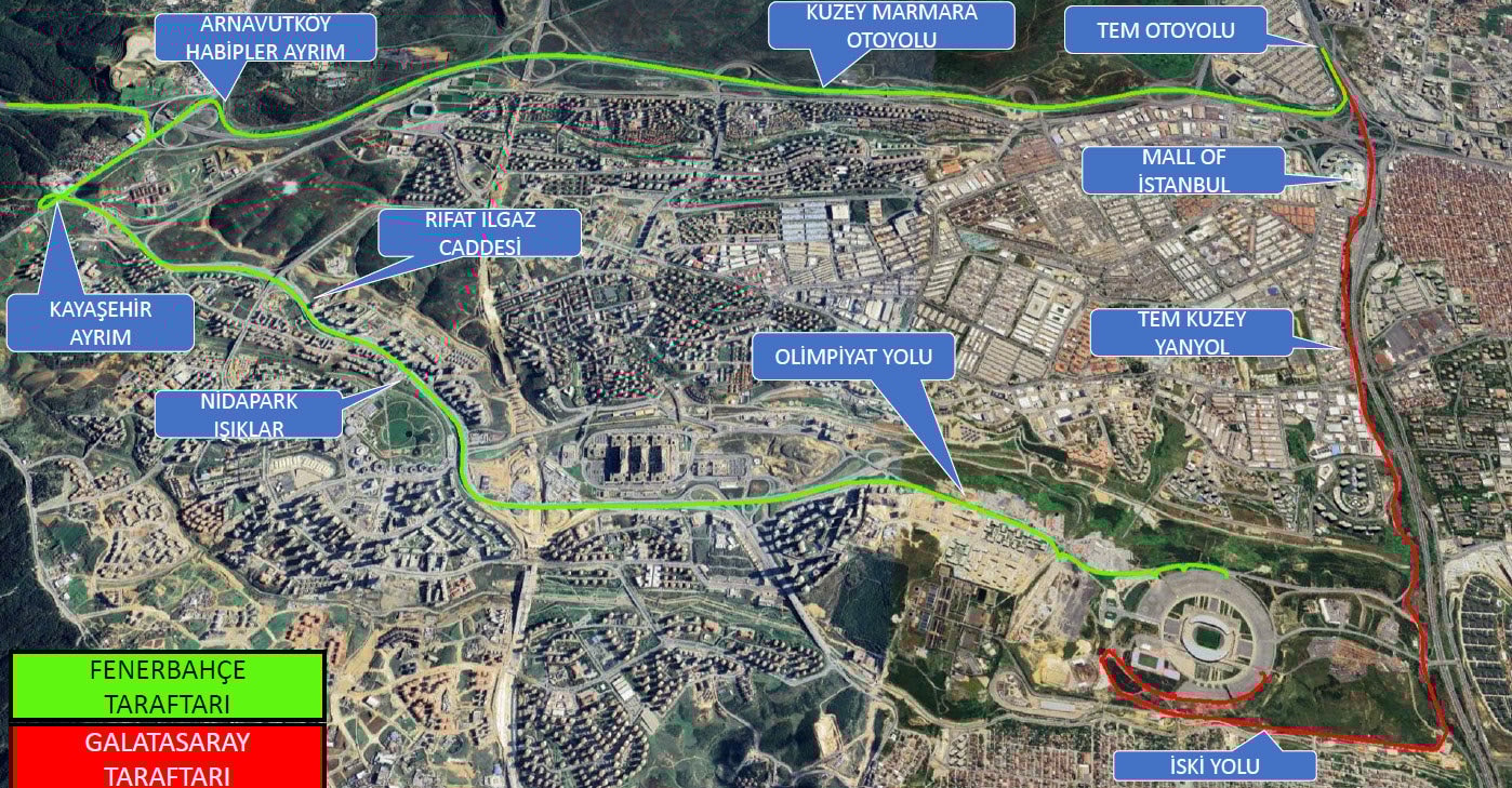 Karşılaşma öncesi stadyuma özel araçlarıyla ve toplu taşıma araçlarıyla giden taraftarlar için bir güzergah planı açıklandı.