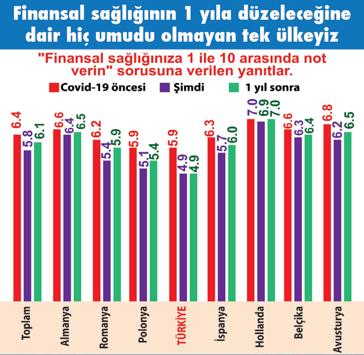 Türkiye’den araştırmaya katılanlar arasında yüzde 22, finansal sağlığının ortalama olduğunu belirtirken, sadece yüzde 16 finansal sağlığını iyi olarak tanımladı. Araştırmada “Finansal sağlığınıza 1 ile 10 arasında not verin; pandemi öncesi nasıldı, şimdi nasıl ve 1 yıl sonra nasıl olur?” diye de soruldu. Türkiye’den katılımcılar pandemi öncesi finansal sağlıklarının 5.9 olduğunu, durumun şimdi 4.9’a düştüğünü, 1 yıl sonra da 4.9 olarak kalmasını beklediğini söyledi. Bu notlarla Türkiye, finansal sağlığı en hızlı düşen ve geleceğe dair en umutsuz ülke olarak dikkat çekti.