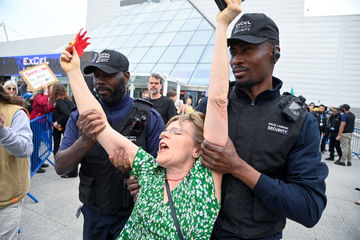 Toplantının yapıldığı ExCeL merkezi önünde Fossil Free London grubu üyeleri ellerinde pankartlarla Shell’i protesto etti.