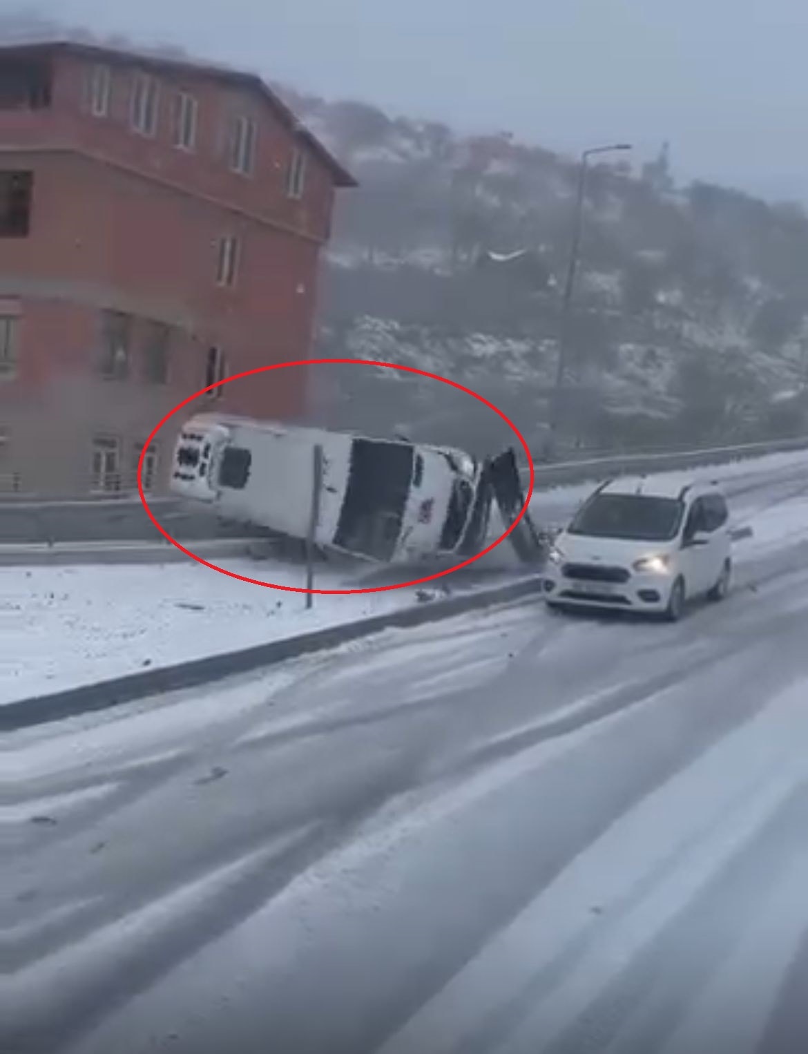 Kayseri’nin Melikgazi ilçesinde Kayseri Organize Sanayi Bölgesi yönünden şehir merkezine seyir halinde olan ve E.G. yönetimindeki servis minibüsü, buzlanan yolda kontrolden çıkarak yönlendirme levhasına çarptıktan sonra devrildi.