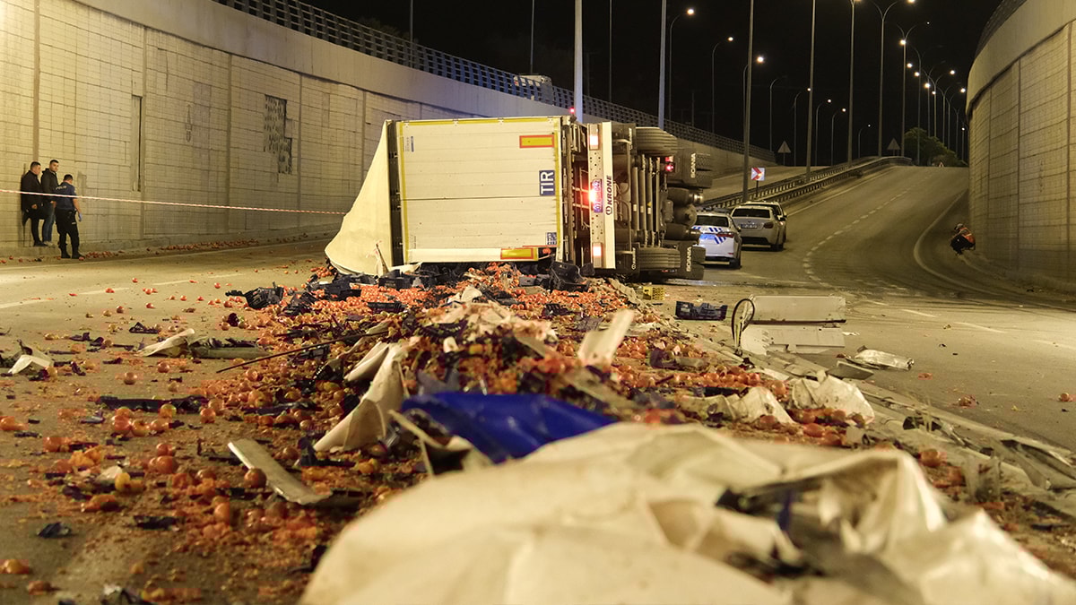 TIR'ın dorsesinde bulunan domatesler yola saçıldı, alt geçit bir süre trafiğe kapatıldı.