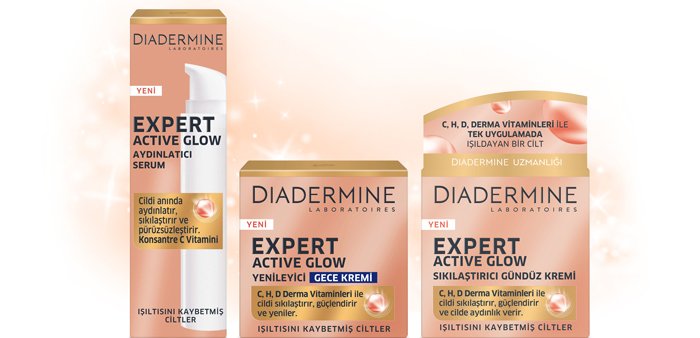 Diadermine tarafından ışıltısını kaybetmiş ciltler için geliştirilen Expert Active Glow serisi; sıkılaştırıcı gündüz kremi, yenileyici gece kremi ve aydınlatıcı serum olmak üzere 3 üründen oluşuyor. Yeni seri; içeriğindeki C, H, D Derma vitaminleri ile cildi sıkılaştırıyor, güçlendiriyor ve cilde aydınlık veriyor. Sadece 4 haftada daha genç görünen ve ışıldayan bir cilde sahip olmanıza yardımcı oluyor.
