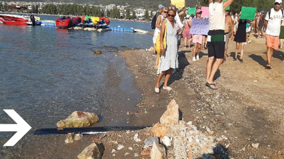 "Kanalizasyon Bitsin Artık, Çevre Bize Emanet Çocuklarımıza Mirastır, Sağlınız için Soğuk Su Plajına Girmeyin" yazılı dövizler taşıyan vatandaşlar "Akbük denizine lağım sularını, kirli sularını döşedikleri borularla belirli saatlerde bırakan bu otelin kendi müşterileri de bu plajdan denize giriyorlar. Çoluk çocuğumuz burada yüzüyorlar. Vücudumuzda değişik şeyler çıktı. Denizden mi oldu acaba diye düşünüyorduk şimdi artık eminiz. Bu boruları buraya bırakanı da buna ses çıkarmayan yetkilileri de Allah’a havale ediyoruz” açıklaması yaptı.