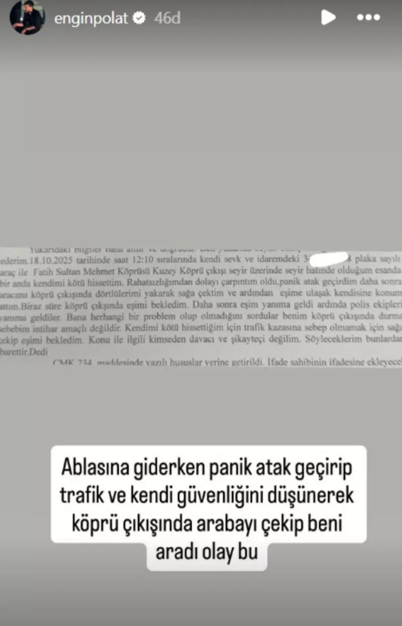 Engin Polat ise iddiaların ardından sessizliğini bozarak açıklama yaptı. Engin Polat, Dilan Polat'ın ablasına giderken trafikte panik atak geçirdiğini söyledi. Bu nedenle aracını yol kenarına çıktığını belirten Polat, olayın sadece bundan ibaret olduğunu dile getirdi.