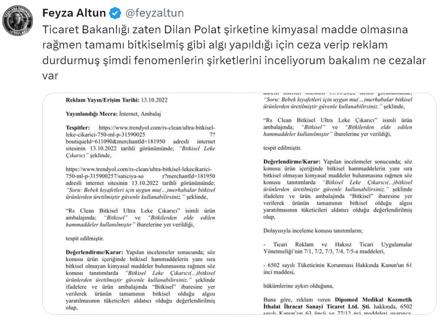 Feyza Altun ürünlerin içinde kimyasal olmasına rağmen tamamen bitkiselmiş gibi tanıtıldığı için reklam durdurma cezası verildiğini de yazdı.