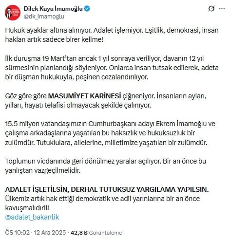 Dilek Kaya İmamoğlu, sosyal medya hesabından yaptığı açıklamada şu ifadeleri kullandı: