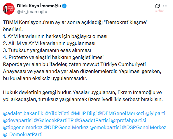 Raporda yer alan bu ifadeler, zaten mevcut Türkiye Cumhuriyeti Anayasası ve yasalarında yer alan düzenlemelerdir. Yapılması gereken, bu kuralların eksiksiz uygulanmasıdır. Hukuk devletinin gereği budur. Yasalar uygulansın; Ekrem İmamoğlu ve yol arkadaşları, tutuksuz yargılanmak üzere ivedilikle serbest bırakılsın."