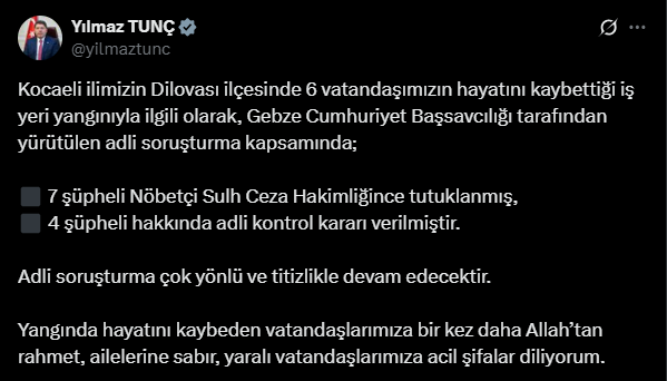 - Kocaeli ilimizin Dilovası ilçesinde 6 vatandaşımızın hayatını kaybettiği iş yeri yangınıyla ilgili olarak, Gebze Cumhuriyet Başsavcılığı tarafından yürütülen adli soruşturma kapsamında; 7 şüpheli Nöbetçi Sulh Ceza Hakimliğince tutuklanmış, 4 şüpheli hakkında adli kontrol kararı verilmiştir.