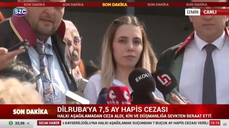 Sokak röportajındaki ifadeleri nedeniyle tutuklanan ve 18 gün sonra tahliye edilen Dilruba Kayserilioğlu bugün hakim karşısına çıktı. Dilruba Kayserilioğlu 7.5 ay hapis cezası verildi. Halka aşağılama suçundan ceza alan Dilruba Kayserilioğlu kin ve düşmanlığa sevkten beraat etti. Hükmün açıklanması geri bırakıldı, Kayserilioğlu cezaevine girmeyecek.