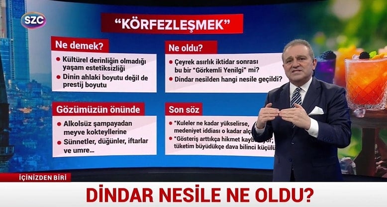 "- Gözümüzün önünde yaşanan gerçeklikler var? Sünnet törenleri, mehter takımları, alkolsüz şampanyalar, nargile kafeler... Baktığınızda bunları topladığımızda şatafatlı bir mağlubiyet diyebiliyor muyuz? Dinin şekli boyutu."
