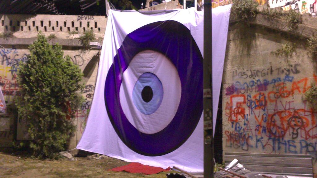 Direnişçiler, Şaşmaz'ın isteğini kırmadı ve parka dev boyutta bir nazar boncuğu pankartı astılar.