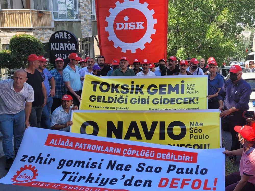 Brezilya Büyükelçiliği önünde bir araya gelen Devrimci İşçi Sendikaları Konfederasyonu (DİSK) üyeleri, “Aliağa patronların çöplüğü değildir. Zehir gemisi Nae Sao Paulo Türkiye’den defol”, “Toksik gemi geldiği gibi gidecek” pankartları açarak, geminin Aliağa’da sökülecek olmasına tepki gösterdi. Protesto gösterisine CHP Ankara Milletvekilleri Gamze Taşcıer ve Murat Emir de destek verdi.