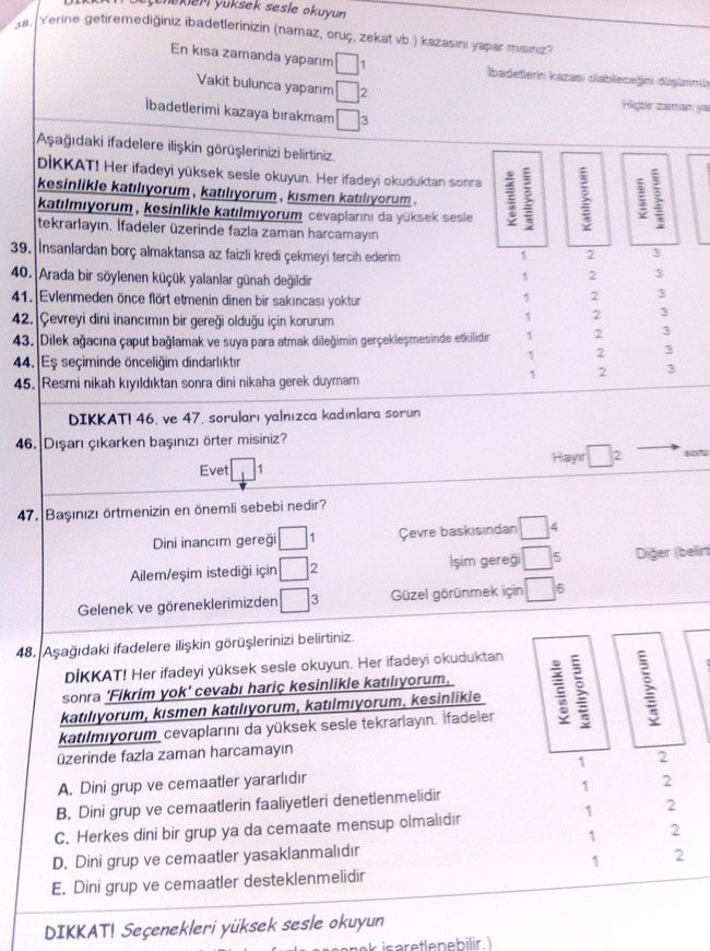 "Hangi dine mensupsunuz, hangi mezhebe göre amel edersiniz?" gibi sorularla başlayan ankette, "Ne zaman dua edersiniz? Loto oynar mısınız? Misafirlikte kadınlar ve erkekler ayrı mı oturursunuz? Hangi namazlara hangi sıklıkla gidersiniz? Sarhoş olmayacak kadar içki içmek sizce günah mıdır? Faizli kredi çeker misiniz? Küçük yalanlar söyler misiniz? Evlenmeden önce flört eder misiniz? Dışarı çıkarken başınızı örter misiniz? Dini grup ve cemaatler yararlı mıdır? Türbeye gider misiniz? Sizce köpek olan eve melek girer mi? gibi sorular yer alıyor.