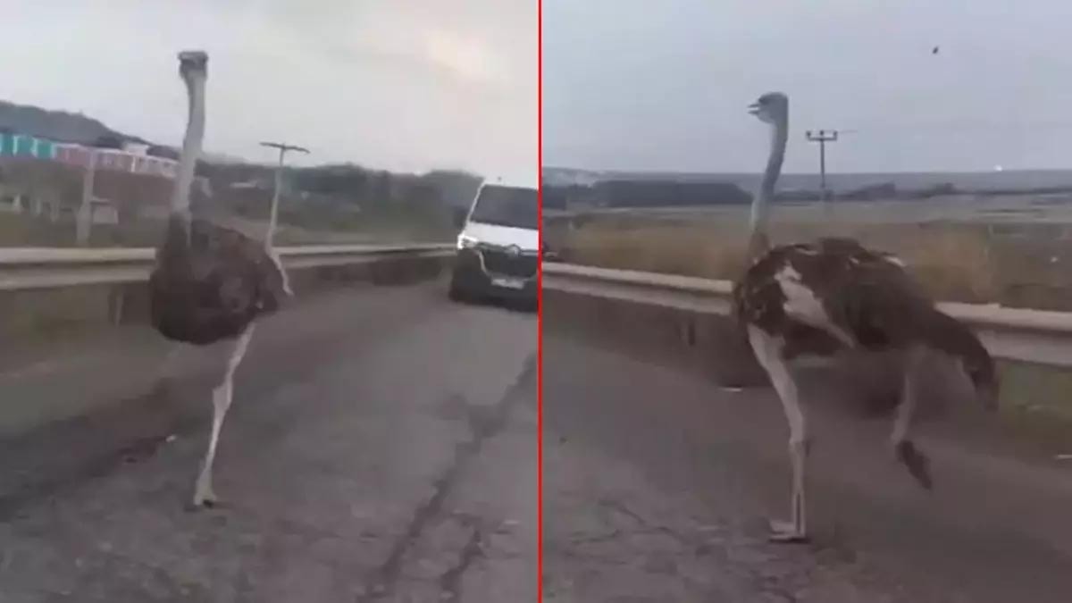 Bu sırada, trafikteki araçlar deve kuşuyla karşılaşınca sürücüler zor anlar yaşadı. O anlar ise cep telefonu kamerasıyla kaydedildi.