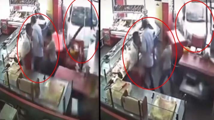 Bu sırada biri çocuk 3 kişi, ezilmekten son anda kurtuldu. Kaza güvenlik kamerasına yansırken, iş yerinde hasar meydana geldi. Kazayla ilgili inceleme başlatıldı.