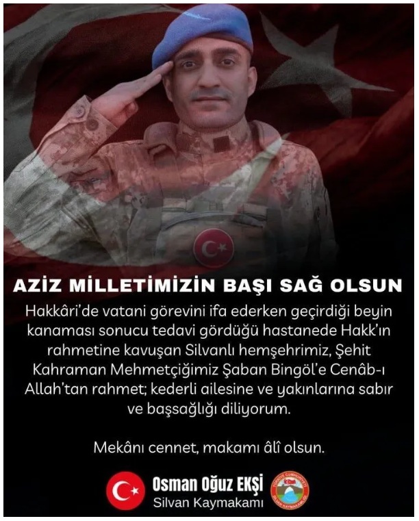 "Hakkâri’de vatani görevini ifa ederken geçirdiği beyin kanaması sonucu tedavi gördüğü hastanede Hakk’ın rahmetine kavuşan Silvanlı hemşehrimiz, Şehit Kahraman Mehmetçiğimiz Şaban Bingöl’e Cenâb-ı Allah’tan rahmet; kederli ailesine ve yakınlarına sabır ve başsağlığı diliyorum. Mekânı cennet, makamı âlî olsun."