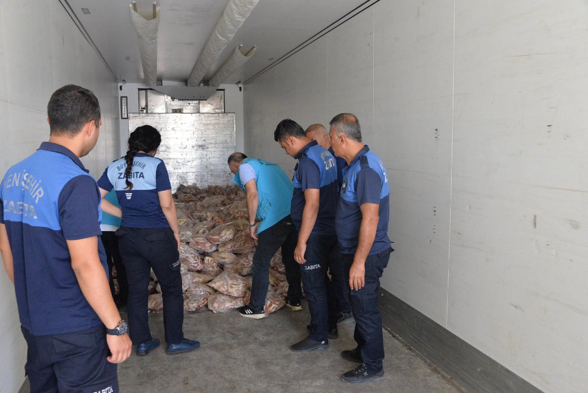 Yenişehir ilçesi Şehitlik Mahallesi'nde park halindeki TIR'da arama yapan ekipler, 5 ton kesim tarihi belirsiz, faturasız kırmızı et ile sakatat ele geçirdi.