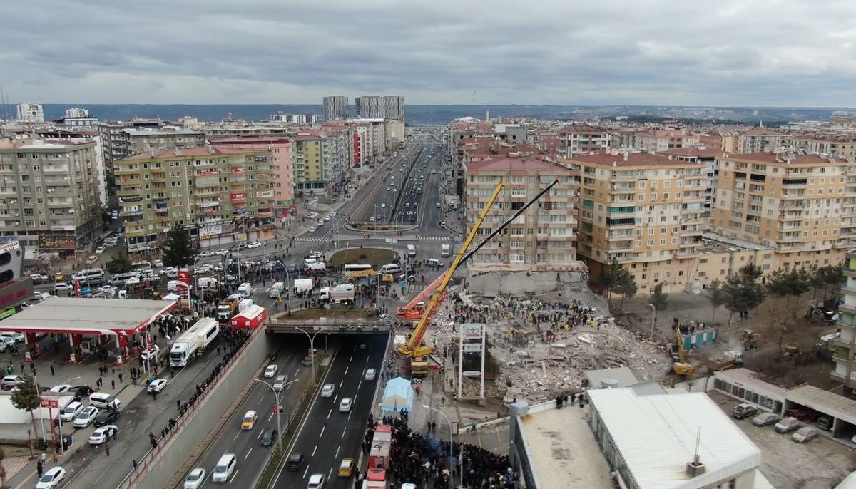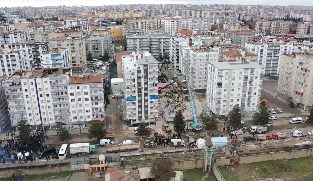 Kahramanmaraş'ta meydana gelen 7.7 ve 7.6 büyüklüğündeki depremlerden etkilenen 10 ilden biri olan Diyarbakır'daki yıkılan binaların enkazları havadan görüntülendi.