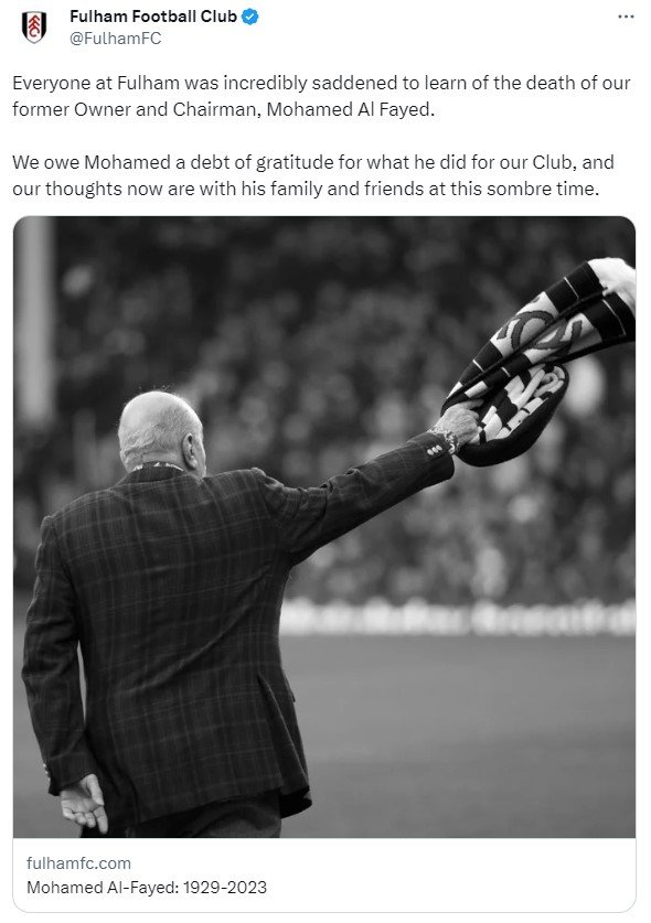 Fulham futbol kulübü dün yaptıkları açıklamada Fulham'daki herkes, eski sahibimiz ve Yönetim Kurulu Başkanımız Mohamed Al Fayed'in ölümünü öğrendiğinde inanılmaz derecede üzüldü. Kulübümüz için yaptıklarından dolayı Mohamed'e şükran borçluyuz ve bu kasvetli zamanda düşüncelerimiz artık onun ailesi ve arkadaşlarıyla birlikte ifadelerine yer verdi.