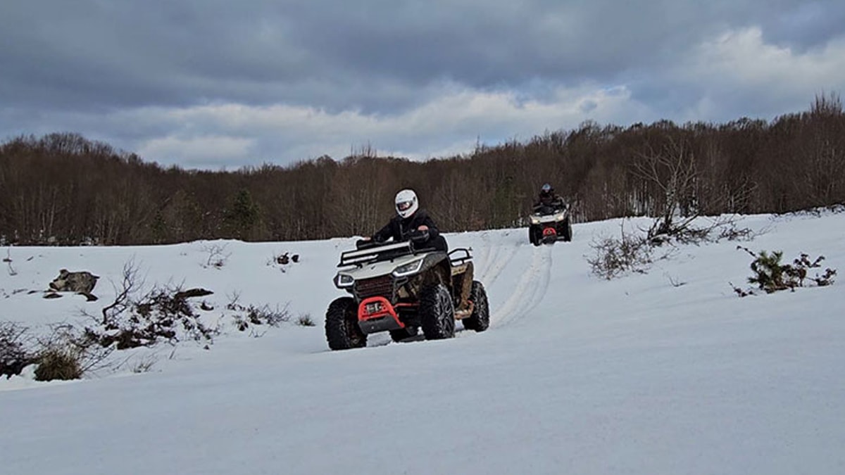 Sürücüler, karla kaplı patikalarda ilerleyerek hem doğanın tadını çıkarıyor hem de belirli noktalarda durarak beyaz örtüyle kaplanmış dağları ve ormanları görüntülüyor.