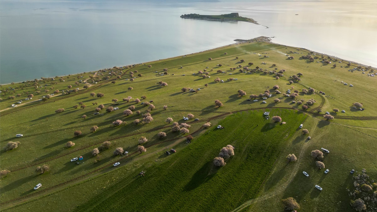 Van Gölü'nün kuzeydoğusunda yer alan yarımada, ağaçların çiçek açması ve doğanın canlanmasıyla seyrine doyum olmayan manzaraya büründü.
