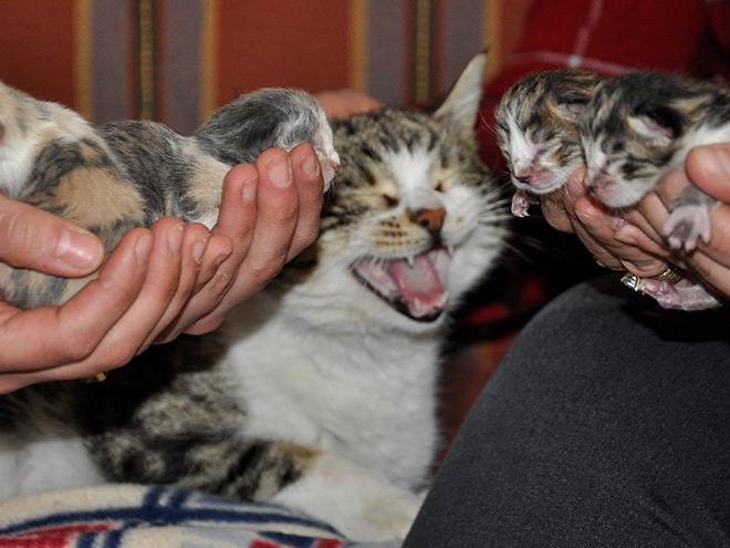 Hemşire ve doktorlar kedinin hamile olduğunu ve doğum sancısı çektiğini anlayarak onu hemen boş bir odaya alıp müdahale etti. Anne kedi, 4 yavru dünyaya getirdi.
