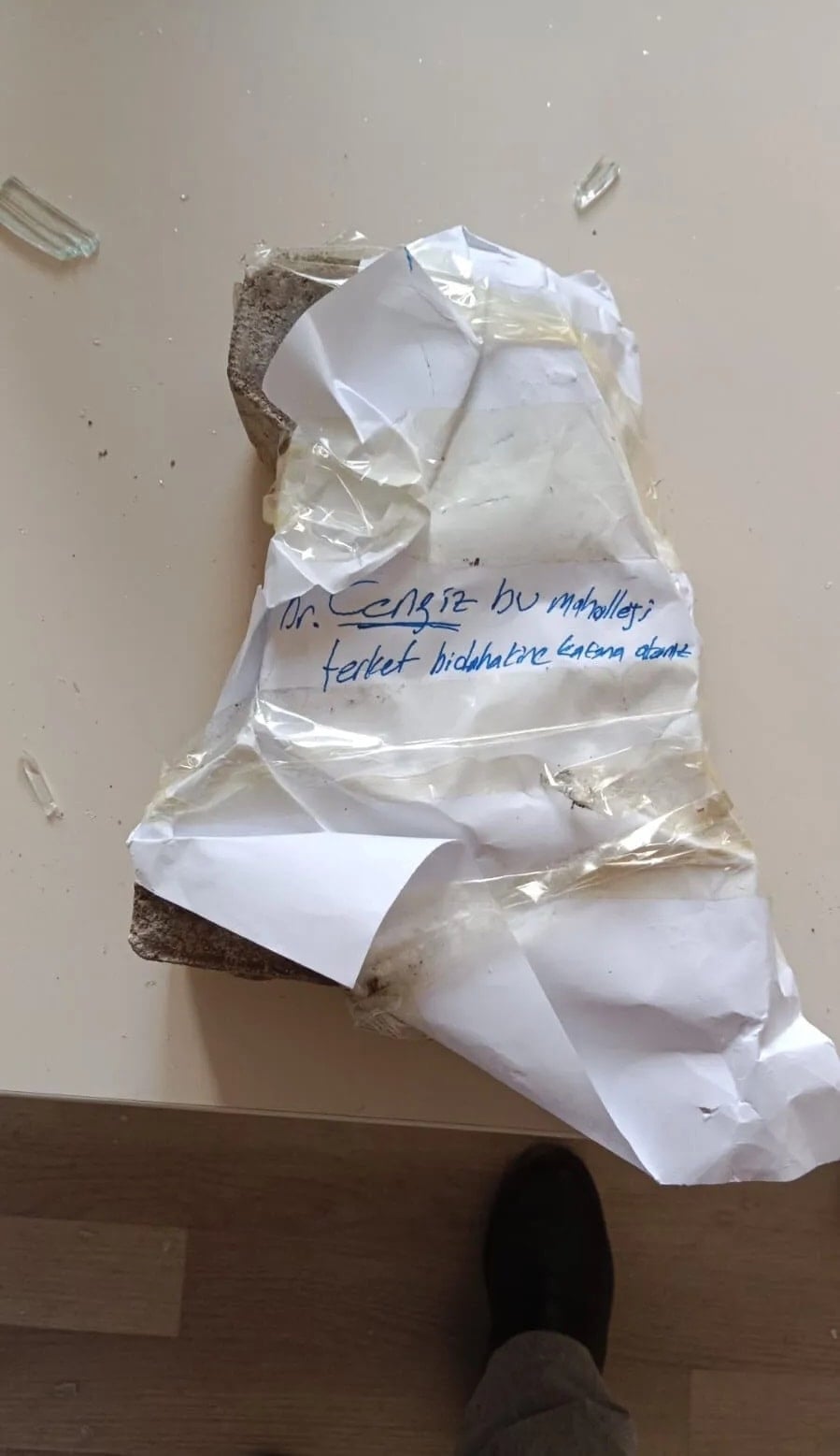 Saldırganların attığı taşın üzerinde, merkezde görev yapan doktora yönelik “Dr. Cengiz, bu mahalleyi terk et, bir dahakine kafana atarız” yazılı tehdit notu bulundu.