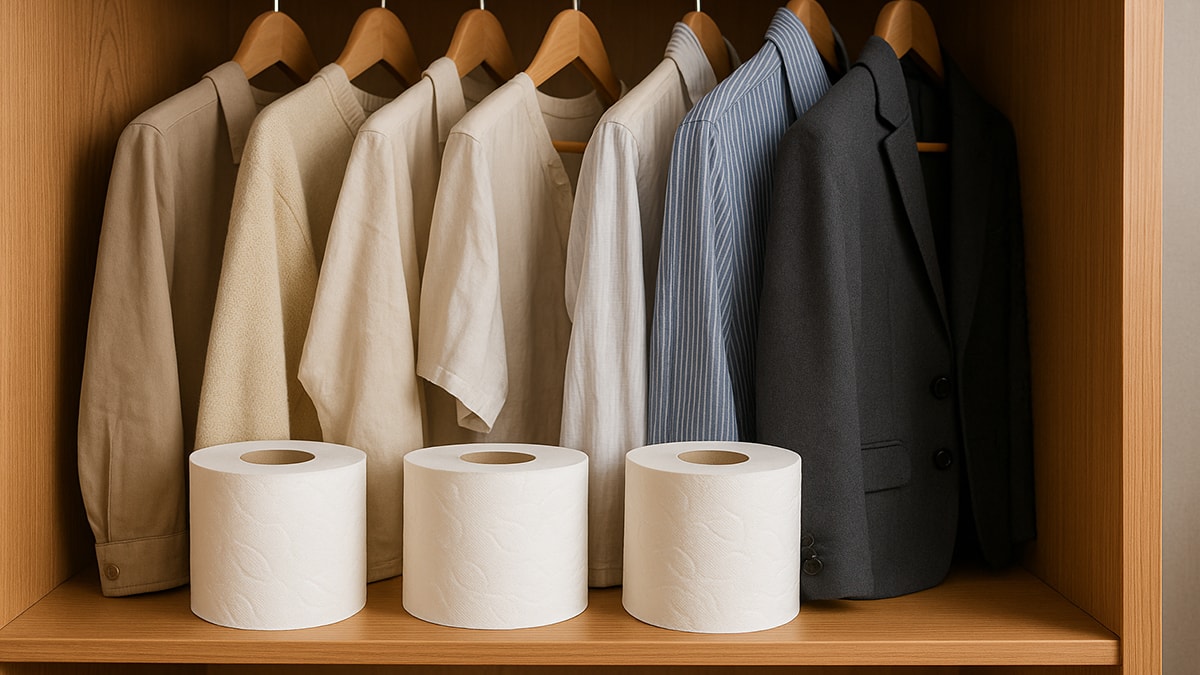 Yöntem oldukça basit. 1 veya 2 rulo tuvalet kağıdını ambalajından çıkarın. Üzerine sevdiğiniz bir uçucu yağdan (lavanta, çam, limon vb.) birkaç damla damlatın. Ruloları gardırobun raflarına yerleştirin.
