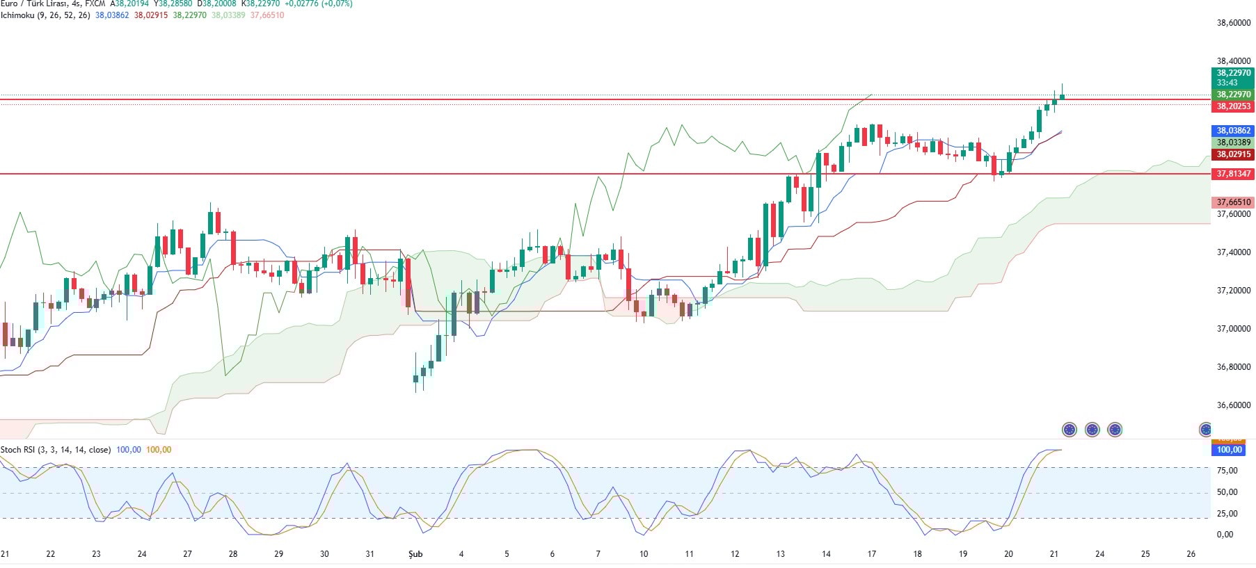 Euro/TL'de yukarı yönlü hareketlenmelerin olduğu görülüyor. Dünü 37,81 ile 38,20 aralığında geçiren Euro/TL günü 38,18 seviyesinde tamamladı. yeni günde ise sabah seansında aynı saat diliminde 38,22 seviyesinde bulunuyor.