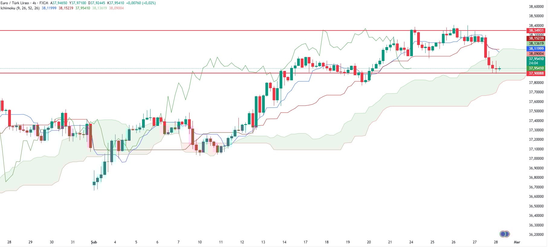 Euro/TL'de yukarı yönlü hareketlenmelerin olduğu görülüyor. Dünü 37,90- 38,34 aralığında geçiren Euro/TL, günü 37,95 seviyesinde tamamladı. yeni günde ise sabah seansında aynı saat diliminde 37,95 seviyesinde bulunuyor.