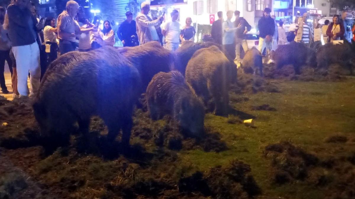 Aydın Kuşadası’nda önceki gece şehir merkezindeki İsmail Cem Dostluk ve Barış Meydanı’na gelen domuz sürüsü görenleri şok etti.