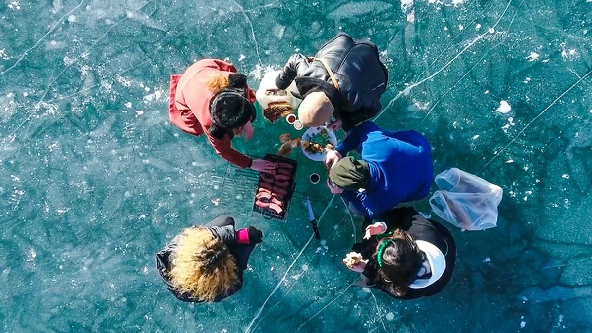 Buz kalınlığının yaklaşık 15 santimetreyi bulduğu gölde bazı vatandaşlar da mangal yaktı. AA