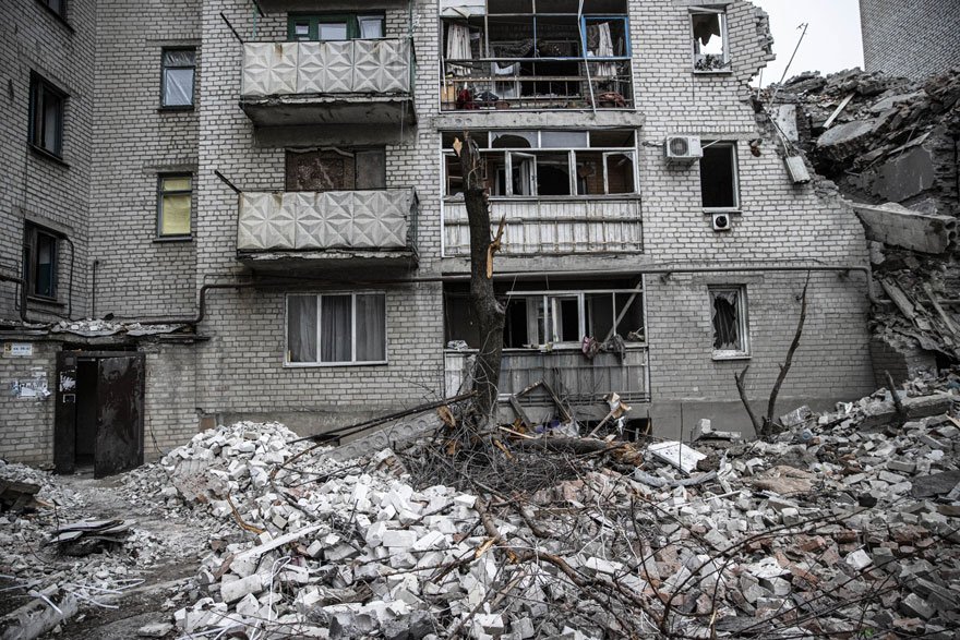3 gün önce Rus güçlerinin Çasiv Yar'ın "Kanal" semtinde düzenlediği füze saldırısı sonucu kısmen yıkılan apartmanda kalanlar oldukça zor şartlarda yaşam mücadelesi veriyor.