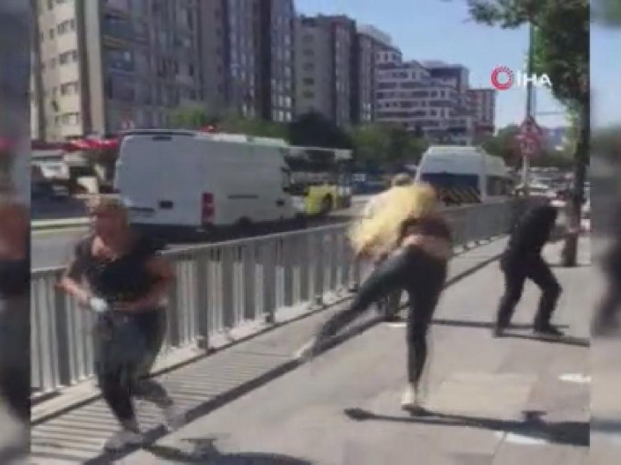 Kavga anı bir vatandaş tarafından cep telefonu kamerasına saniye saniye yansıdı. Görüntülerde, kavgaya karışan kadınlar ile adamın ellerine geçen her şeyi birbirine fırlattığı, daha sonra kadınların adama saldırdığı ve trafiğin durduğu görülüyor. (İHA)
