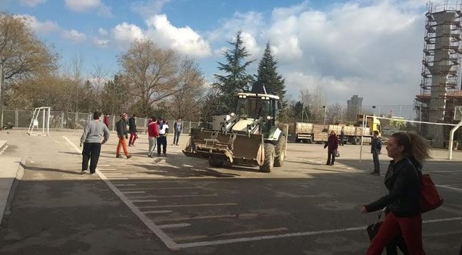 Dozerler, vinçler, kepçeler, liseli çocukların basketbol, voleybol oynadıkları, gezinti yaptıkları ve dinlendikleri alanı işgal ediyor. Öğrenciler, büyük tehlike altında bahçede oyun oynayıp zaman geçiriyorlar. Sık sık hareket halinde olan iş makinaları öğrencilerin arasında manevra yapıyor.