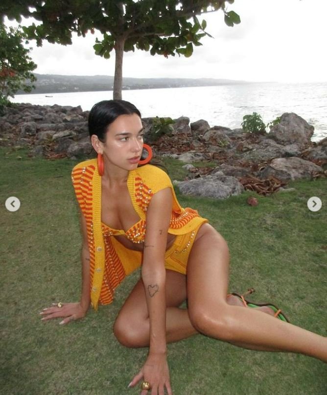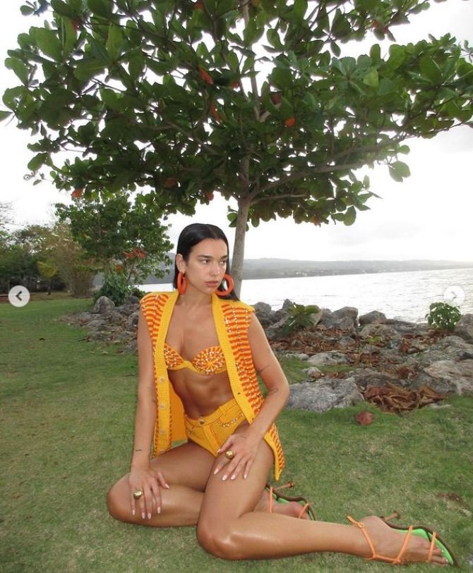 Dünyaca ünlü İngiliz şarkıcı Dua Lipa, Jamaika tatili esnasında parlak turuncu bir tığ işi bikini ve ona uygun bir yelek giyerek formda fiziğini sergiledi.