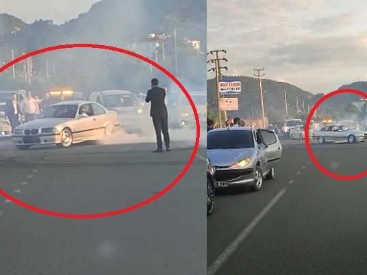 Görüntülerde, otomobili sürekli döndüren sürücünün, lastik yakarak duman çıkardığı ve damadın da alkışlarla desteklediği anlar yer aldı.