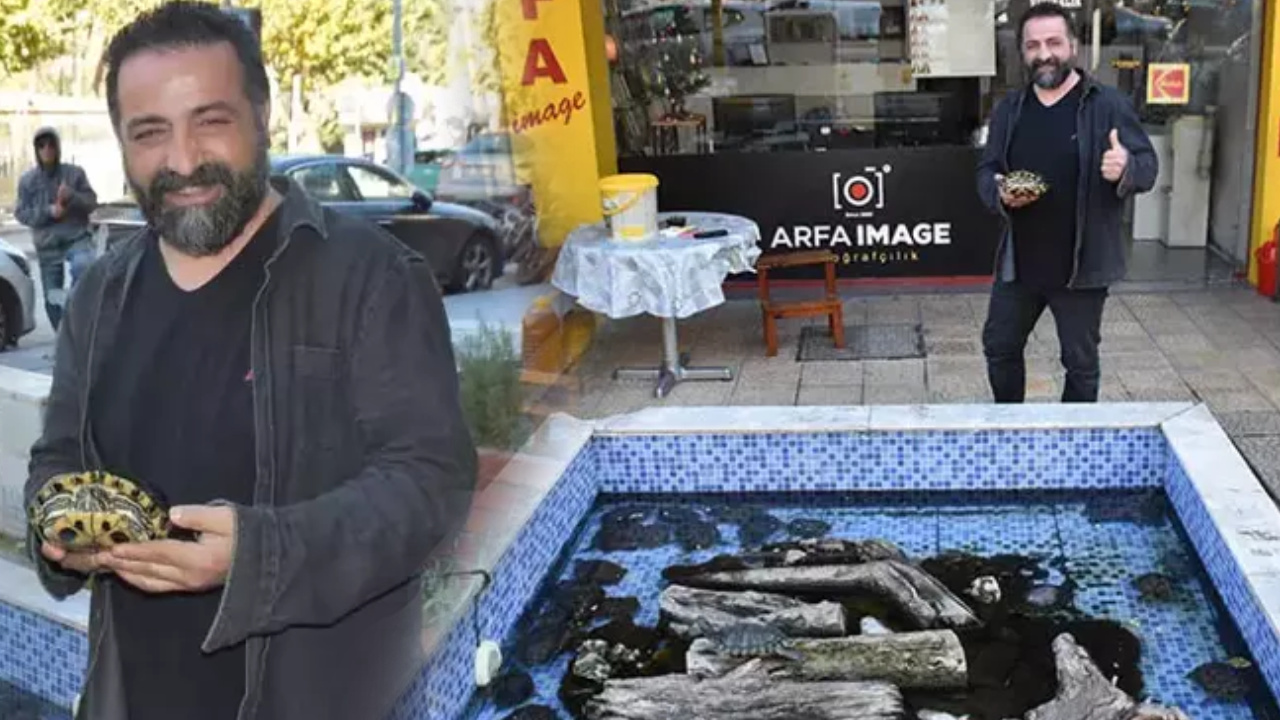 Karşıyaka ilçesi Bostanlı Mahallesi'nde 25 yıldır fotoğrafçılık yapan Volkan Çakır, iş yerinin önüne 2000'li yılların başında içinde 5 su kaplumbağası bulunan akvaryum koydu. Bu nedenle çevresinde 'kaplumbağalı fotoğrafçı' olarak tanınan Çakır, zamanla kaplumbağalarının sayısı artınca bu kez iş yerinin önüne havuz yaptırdı.