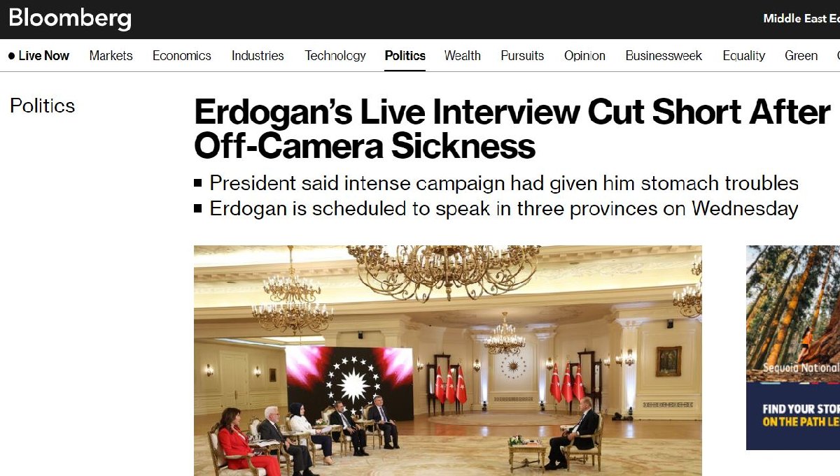 Bloomberg'deki haberde, "Türkiye'nin cumhurbaşkanı Recep Tayyip Erdoğan, Salı akşamı canlı yayındayken beklenmedik bir sağlık sorunu yaşadı" denildi. Erdoğan'ın 20 yıllık iktidarına devam etmek için mitinglere katıldığına dikkat çeken Bloomberg bugün Erdoğan'ın 3 mitine katılmayı planladığını da aktarmıştı. Fakat bugün Cumhurbaşkanı Erdoğan resmi Twitter hesabından bu ziyaretleri ertelediğini duyurdu.