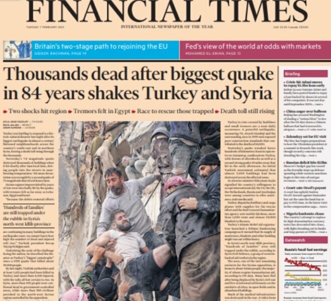 "Son 84 yılın en büyük depreminin Türkiye ve Suriye'yi sallamasının ardından binlerce ölü" manşetini atan Financial Times, depremi “neredeyse son 100 yılın en büyük doğal afeti” olarak niteledi.